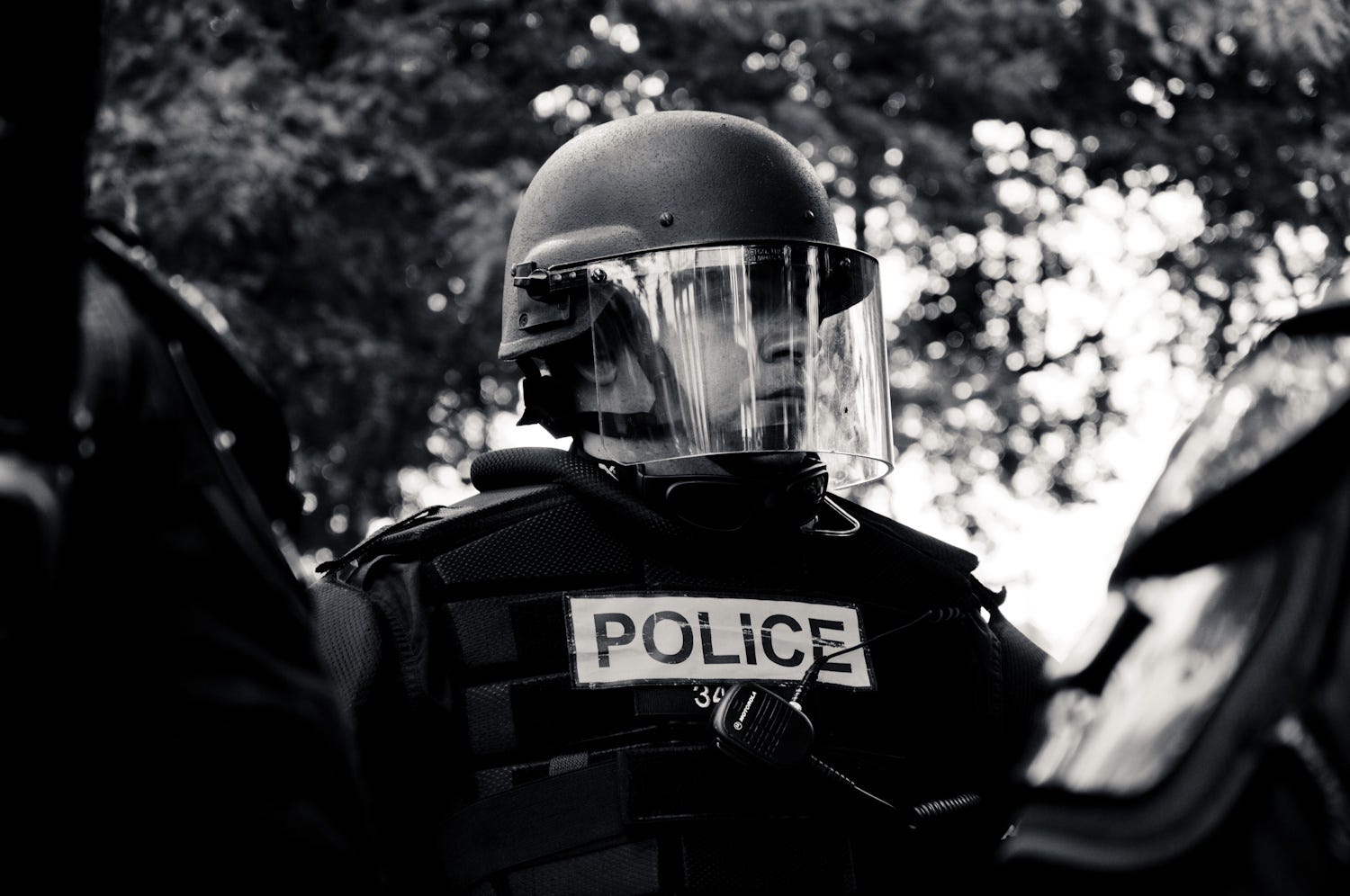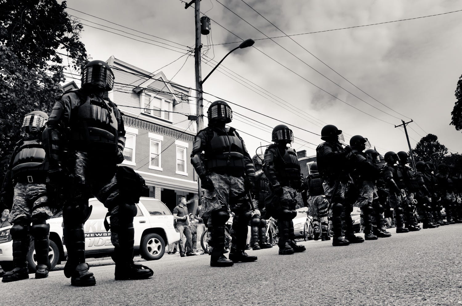 A van pulled up alongside me, headed the wrong way down a one-way street. The door slid open. Men in riot gear spilled out, a dozen of them, with something like glee on their faces. One man stopped. He took stock of the frightened students who’d paused to watch all the chaos. He nudged his buddy and bellowed, “Time to kick some ass!” He slammed the visor down on his helmet, and he went running into the crowd of students, his baton swinging.