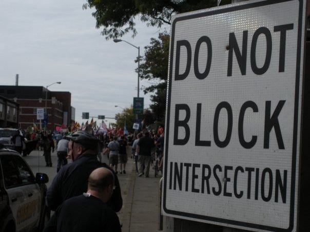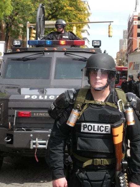 The cops — dozens of agencies from around the country, all assembled in Pittsburgh like the leaders and the protesters — cracked down, hard. They blasted us with an LRAD — a Long-Range Acoustic Device. It’s a military-grade “sound cannon” that can cause permanent hearing loss, hitting us with piercing, shrill, ululating sounds that caused instant headaches and made people instinctively turn and run.