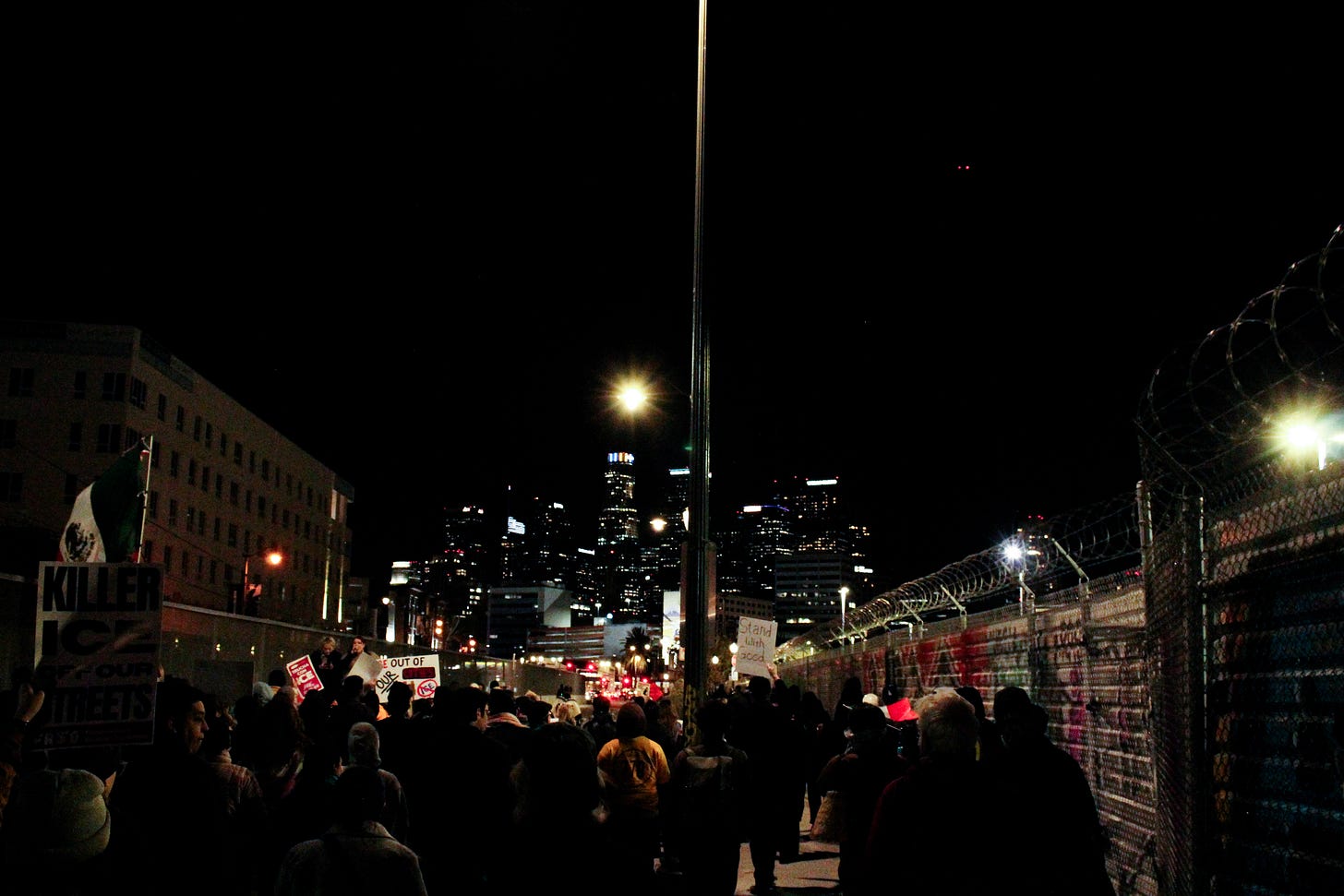 We marched to the Metro Detention Center in Downtown Los Angeles, where people have protested for months on end, watching white vans with no license plates come and go, bringing people in shackles into a crowded basement full of cages.