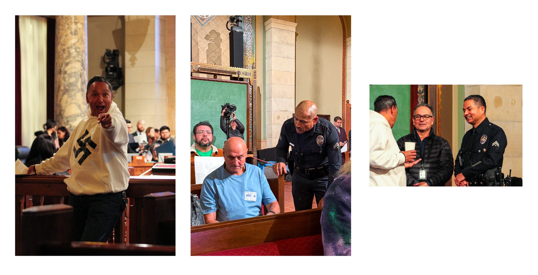 While she spoke, one man in the gallery behind me confronted another, who wore a swastika on his hoodie.